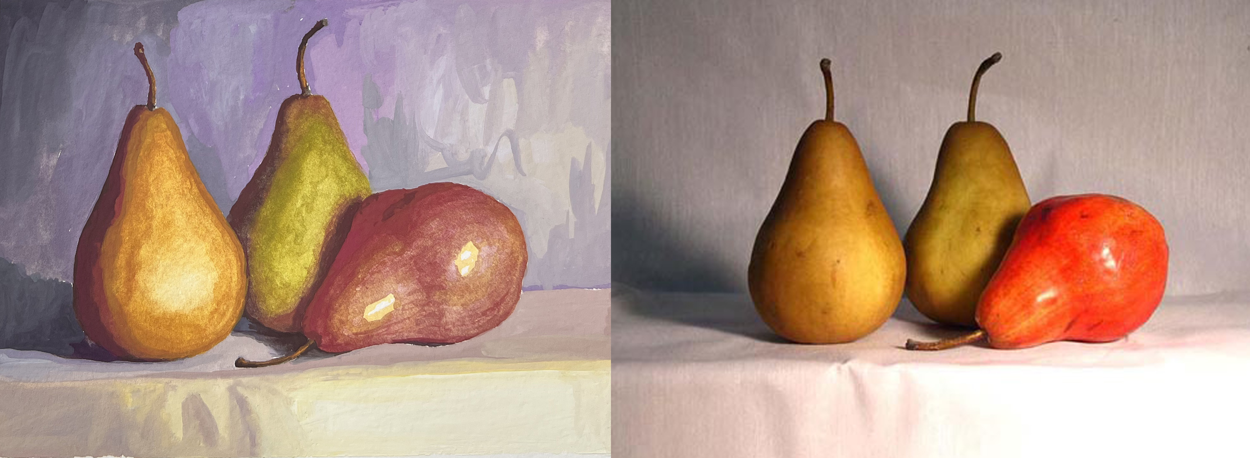 If you look at the reference photo for the study of the three pears you will notice that the red in my painting is not nearly vibrant enough, its shadow isn't dark enough, the background isn't purple, and the shadows on the other pears aren't so red.