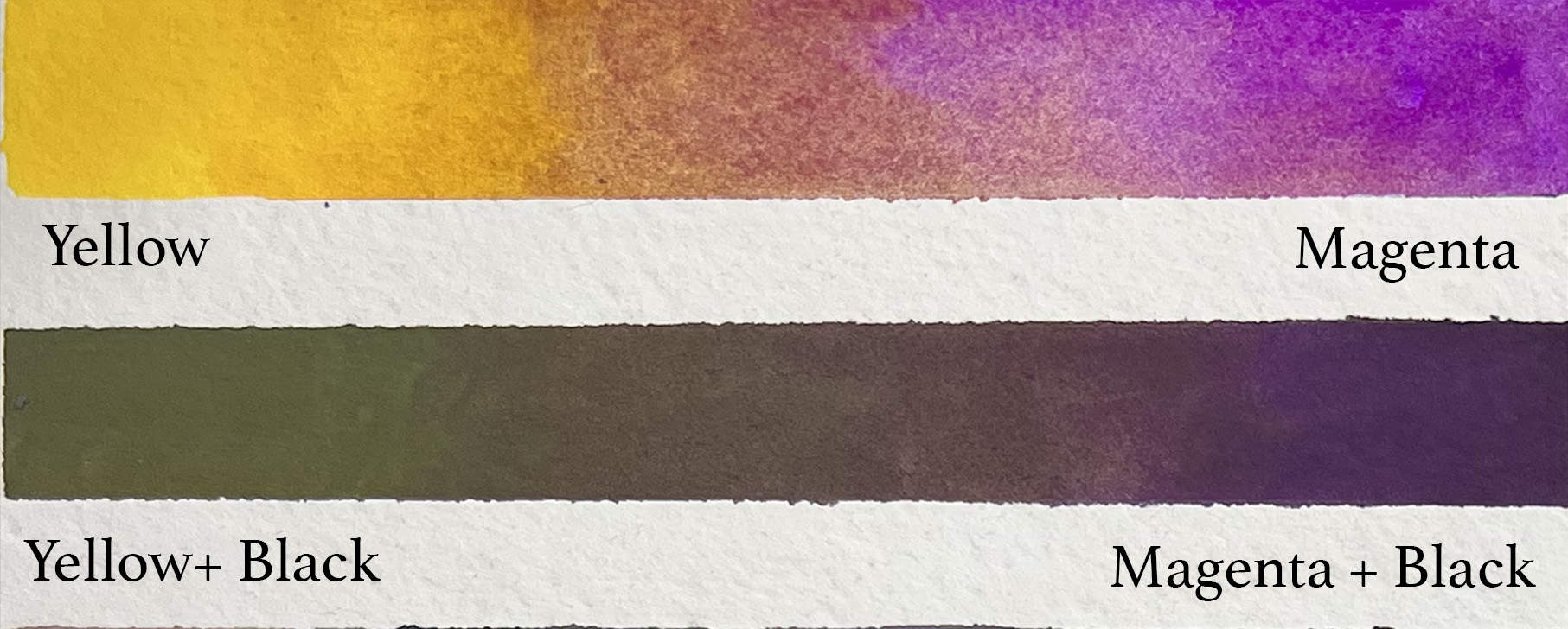 In this particular lesson of Color Theory for Painters, the challenge is to pick two colors that are far away from each other on the color wheel and see how far you can push them when you include black and/or white, depending on your medium. (Watercolor won't use white, for example, but will instead use water to lighten.) This could be a complementary pair, which means they would be opposite each other on the color wheel, or slightly off from complementary colors, like with Magenta and Yellow.